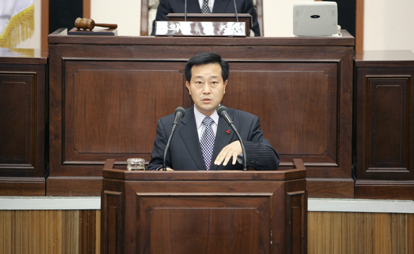 제123회 임시회 제4차 본회의시 김태근 산업건설위원회 간사가 상임위원회에서 활동한 결과를 본회의에 보고하고 있다.